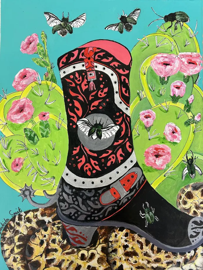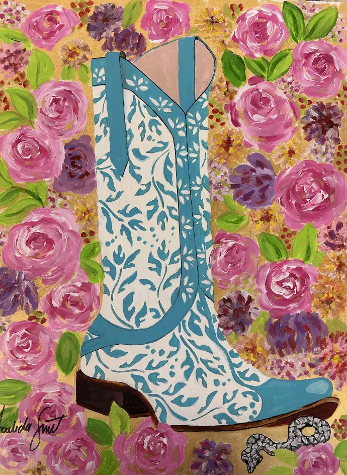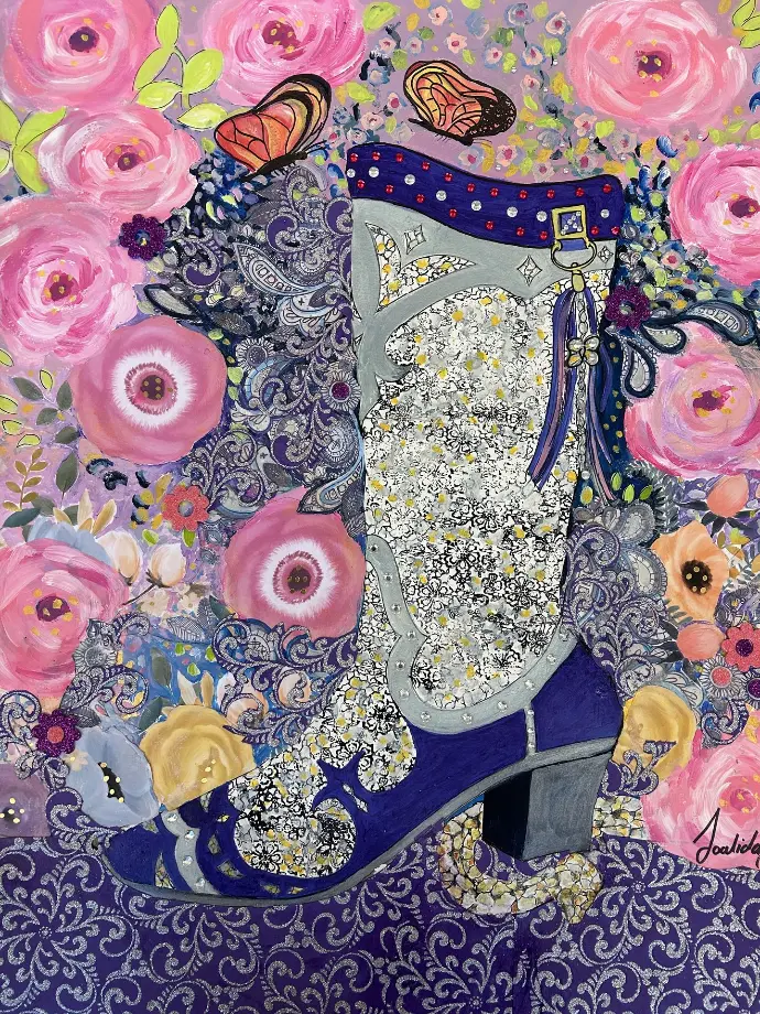 Fashion is where I return to play — revisiting the symbols that shaped my childhood and reimagining them as vessels of transformation. Painted in acrylic on paper, my series of Cowboy and Victorian boots surrounded by butterflies and dragonflies speaks to toughness and freedom, frivolity and delight. Through recurring symbols of metamorphosis, these works explore resilience, protection, and beauty, revealing fashion as more than surface — as spark, vitality, and life force. This playful energy becomes the current that fuels the deeper, more existential explorations of Flowers and Forests, grounding them in both memory and imagination.